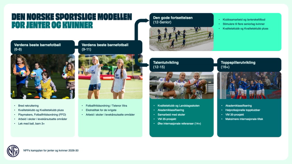 Jenter og gutter utvikler seg ulikt, og for å fange opp egenarten i jenters utviklingsløp, er en sentral del av denne kampplanen å lansere «Den norske modellen for spillerutvikling av jenter og kvinner».